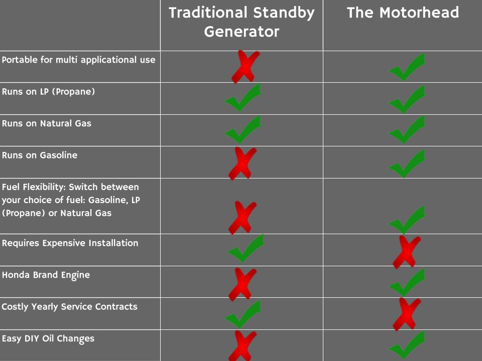| There are no road taxes on propane or natural gas | Pay road tax on gasoline to run your generator |